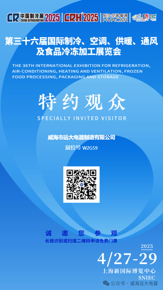 您好!非常感謝您長期以來對威海遠(yuǎn)大電器的大力支持,第三十六屆中國制冷展即將亮相上海,屆時我們展會現(xiàn)場將會進(jìn)行我司產(chǎn)品陳列展示,在此,我們誠摯的邀請您蒞臨我司展位參觀指導(dǎo),我們將會為您提供貼心、專業(yè)的產(chǎn)品與技術(shù)服務(wù)。