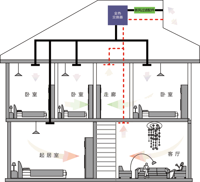 當(dāng)全熱交換器在夏季制冷期運行時,新風(fēng)從排風(fēng)中獲得冷量,使溫度降低,同時被排風(fēng)干燥,使新風(fēng)濕度降低;在冬季運行時,新風(fēng)從排風(fēng)中獲得熱量,使溫度升高,同時被排風(fēng)加濕。新風(fēng)換氣機是一種將室外新鮮氣體經(jīng)過過濾、凈化,熱交換處理后送進室內(nèi),同時又將室內(nèi)受污染的有害氣體經(jīng)過過濾、凈化。